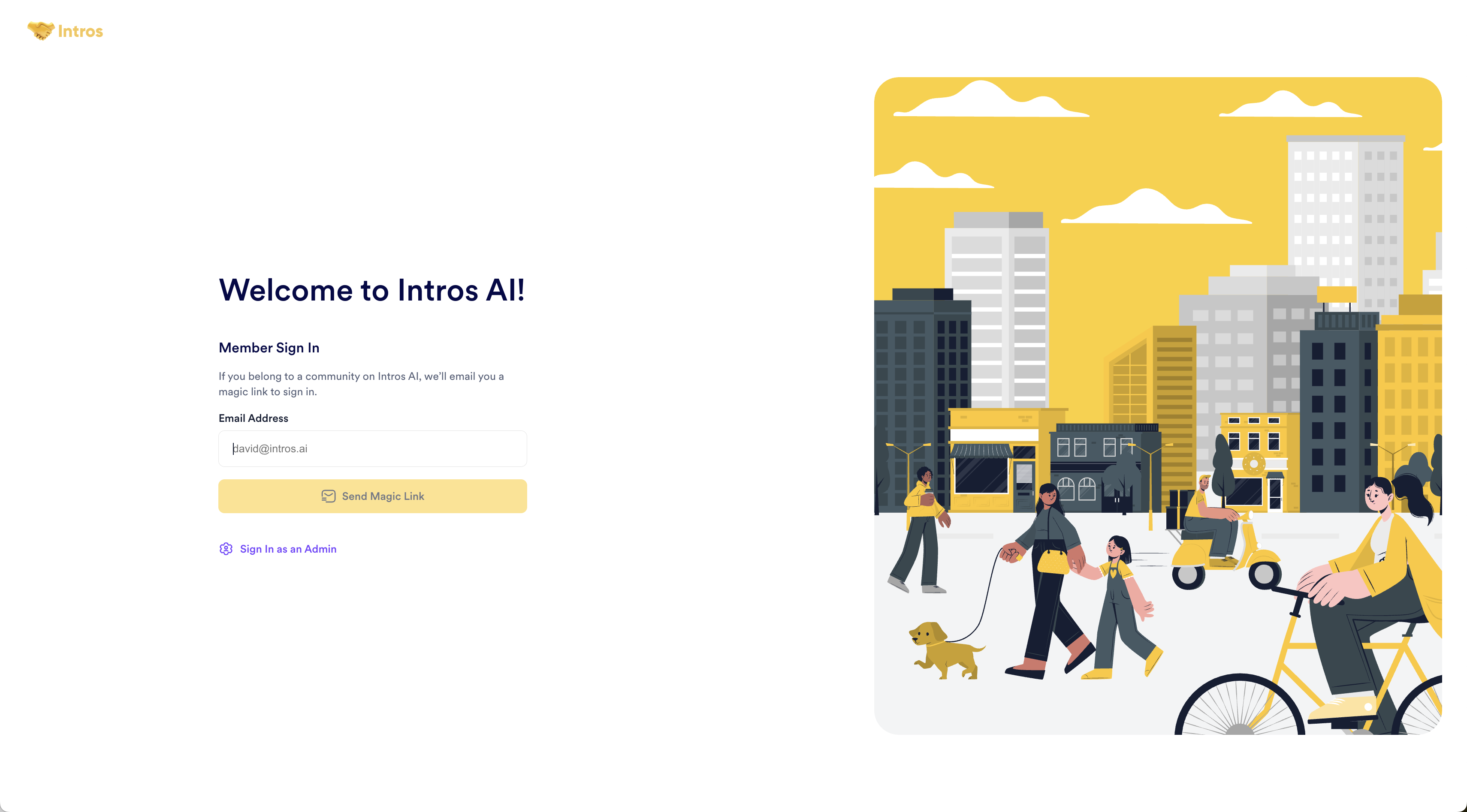 Standard Website Login: Visit intros.ai, click “Log In”, then sign in as a member using their email & receive a magic link.