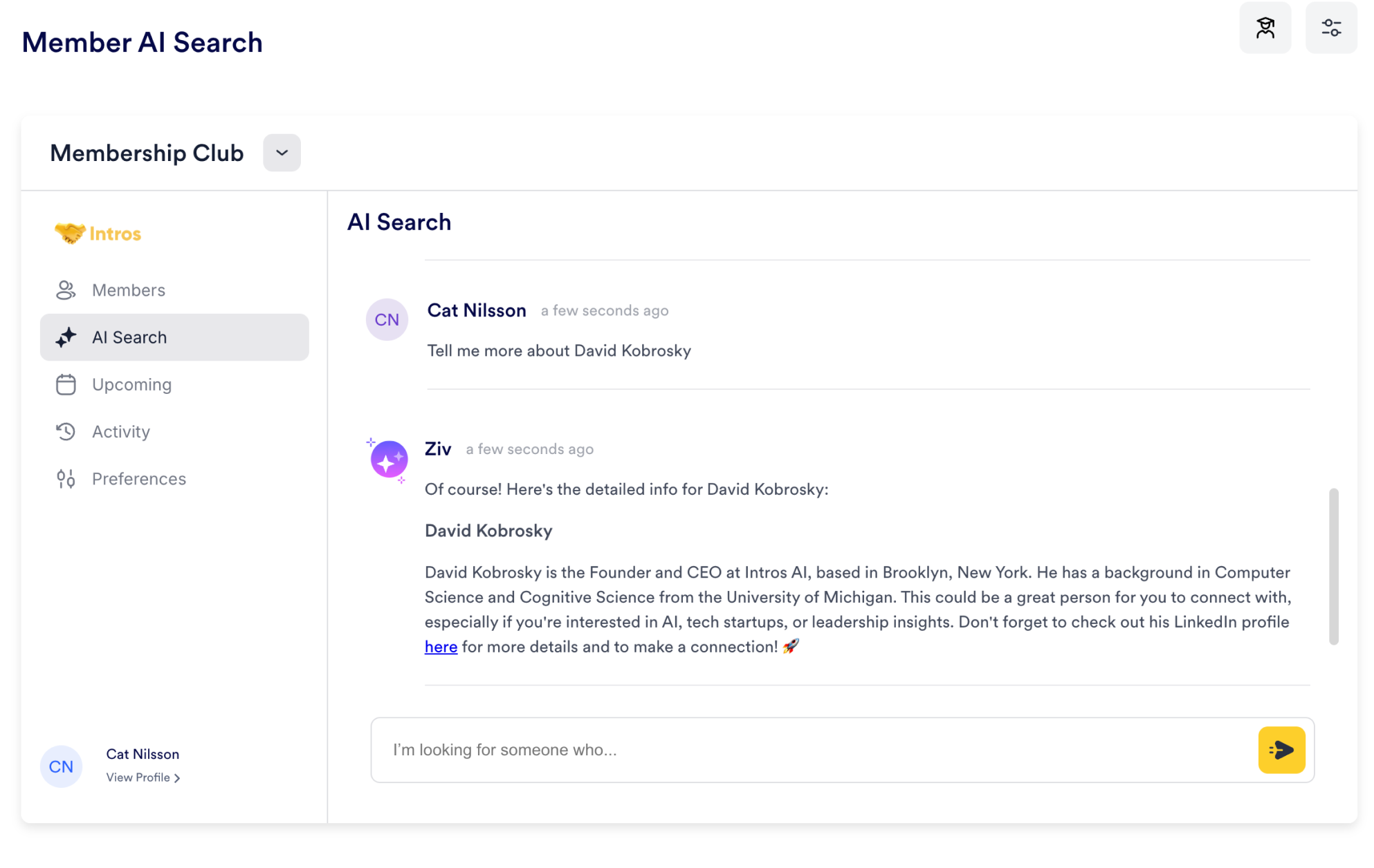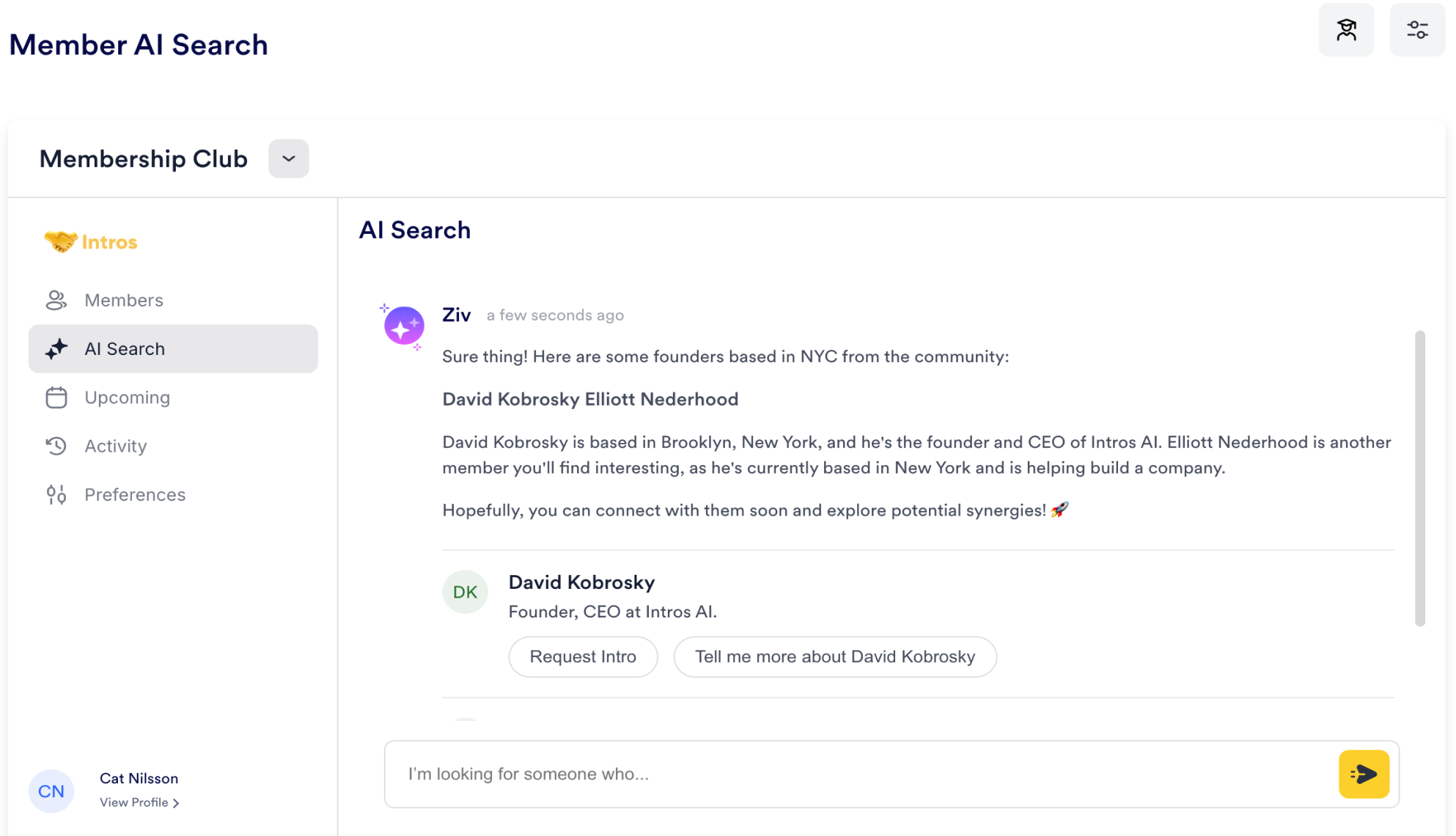 Below is an example of a member query: “I’m looking for founders based in NYC.” Ziv, our chatbot, will return relevant members based on the query.