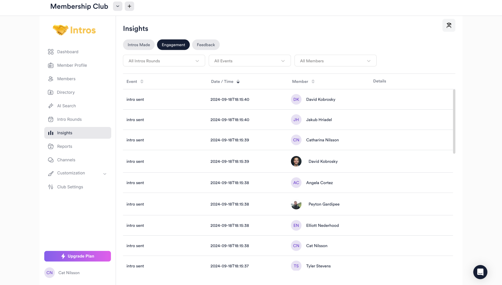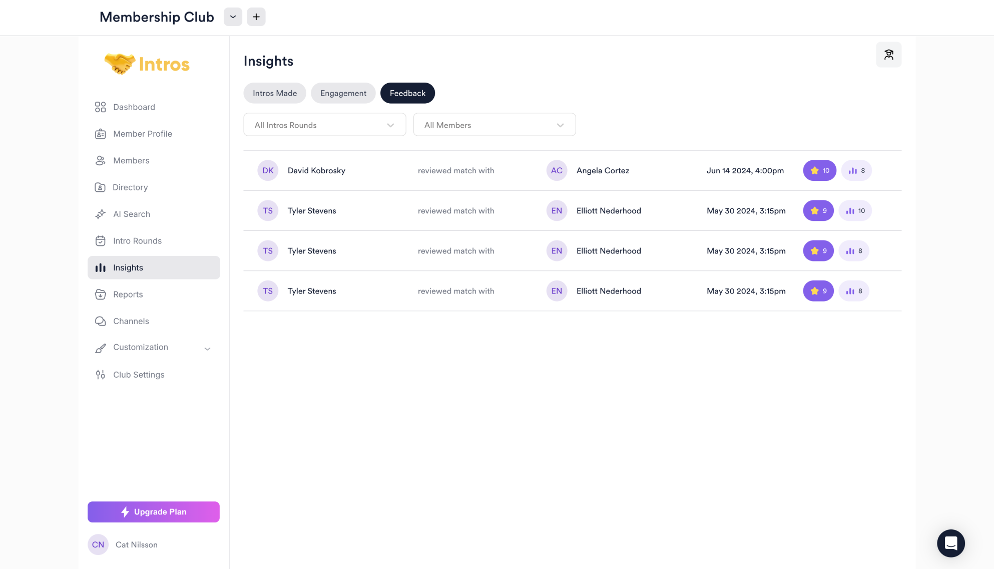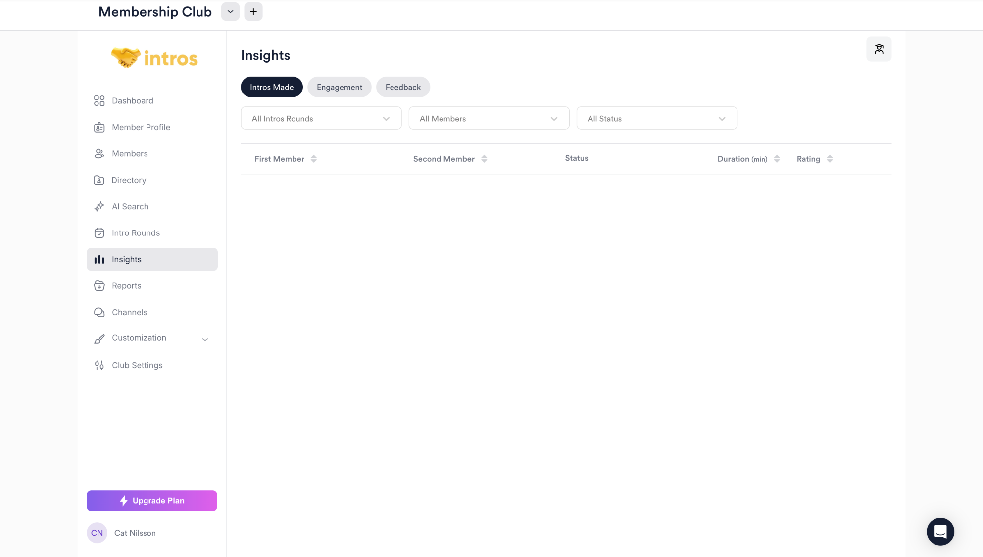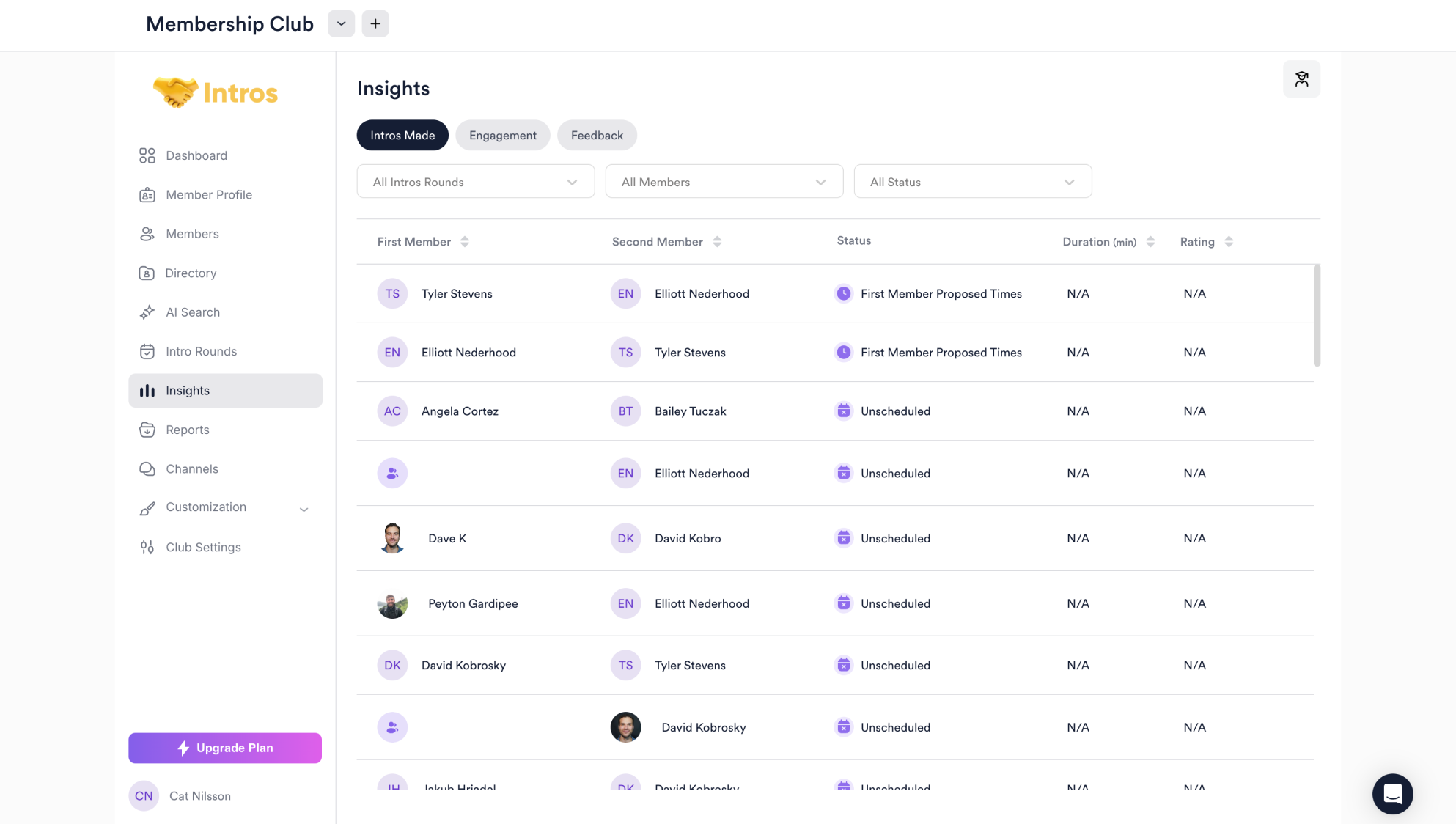 In the Intros Made tab, you can view matches between members and a brief overview of information, including status, duration, and rating.